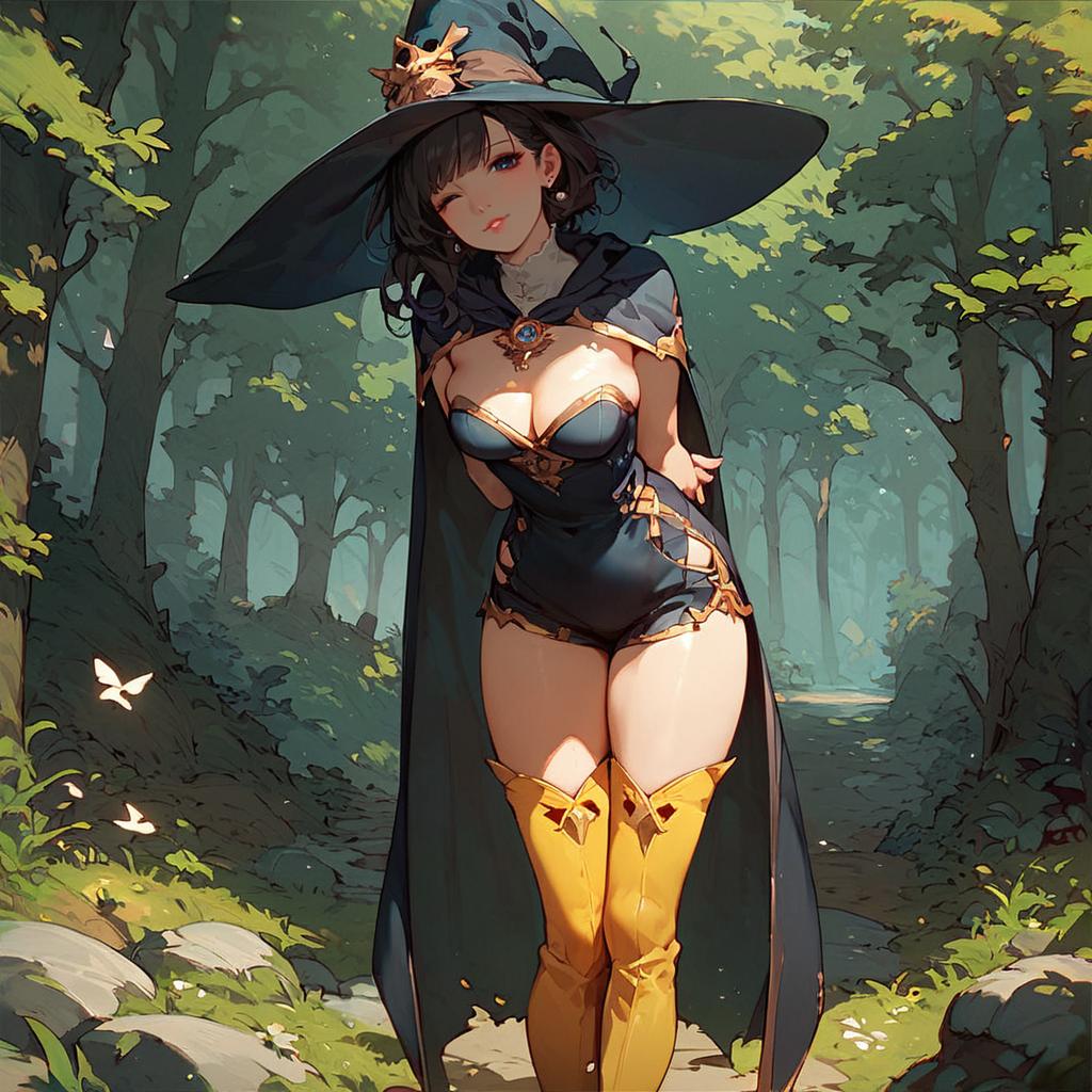 Anime-style digital artwork of a smiling young female witch character with light purple twin braids, wearing a large blue witch hat, a brown cape, a purple long-sleeve shirt, and a black lace-up skirt. The character stands confidently looking directly at the viewer with a charming smile. The image features detailed clothing and accessories, including gold and black fasteners and earrings.