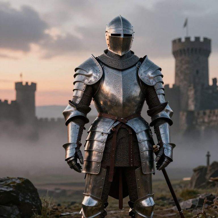 Heavy armor knight standing on a misty battlefield at dawn, intricate steel plates reflecting soft light, detailed engravings, medieval castle ruins in the background, dramatic sky