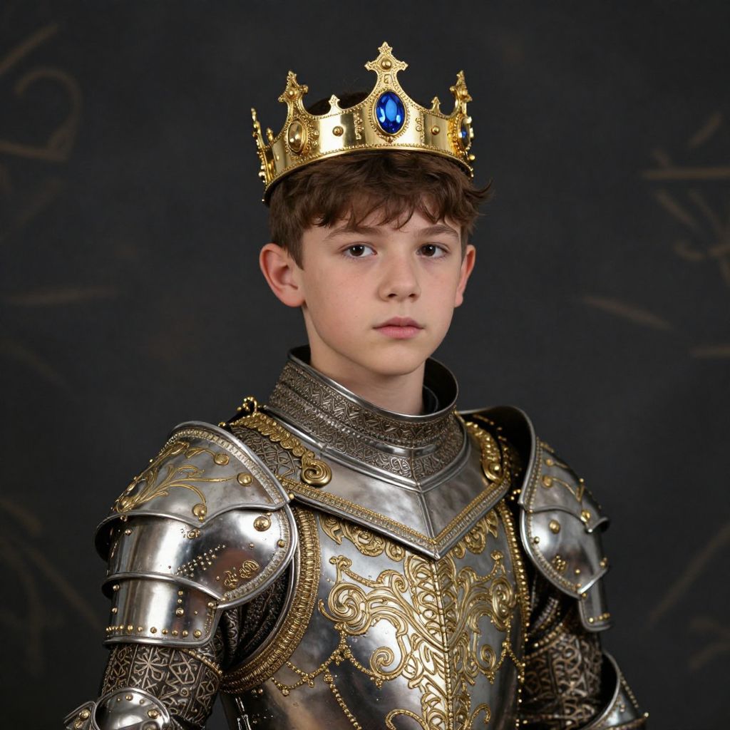 A young boy, around 8 years old, with bright green eyes and messy brown hair, is wearing a vibrant red and gold outfit featuring a detailed embroidered pattern and a golden crown on his head. He stands confidently with his hands on his hips, looking directly at the camera with a mischievous yet proud smile. The background is a sunny, open meadow with soft golden light filtering through the trees, giving the scene a whimsical and magical atmosphere.