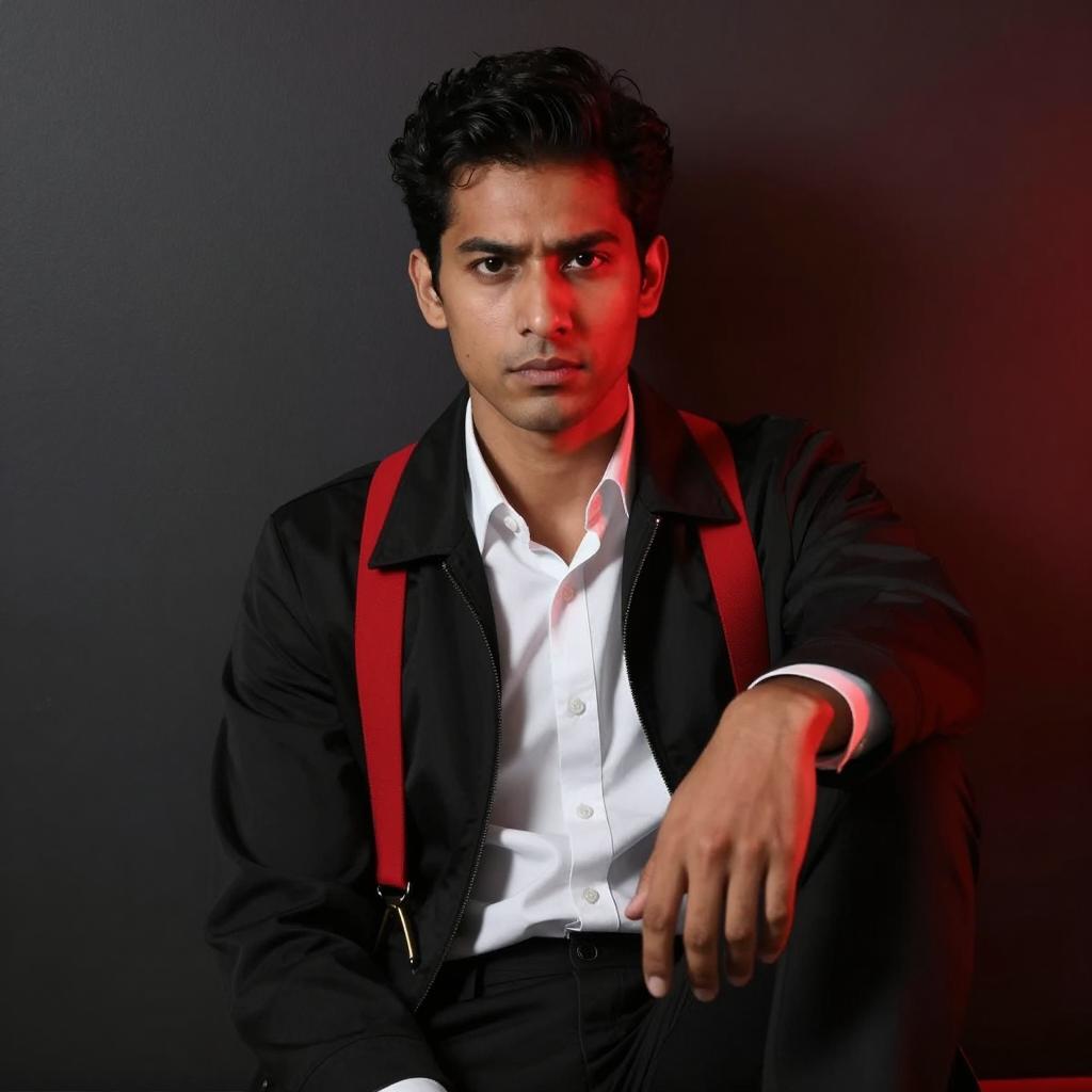 Muscular man with dark hair, tan skin, and white tank top leans over open red truck window. Man inside truck has short dark hair, mustache, and black shirt. Sunlight casts shadows. Truck door handle in left foreground. Power lines and sky in background. Both men look up at each other.