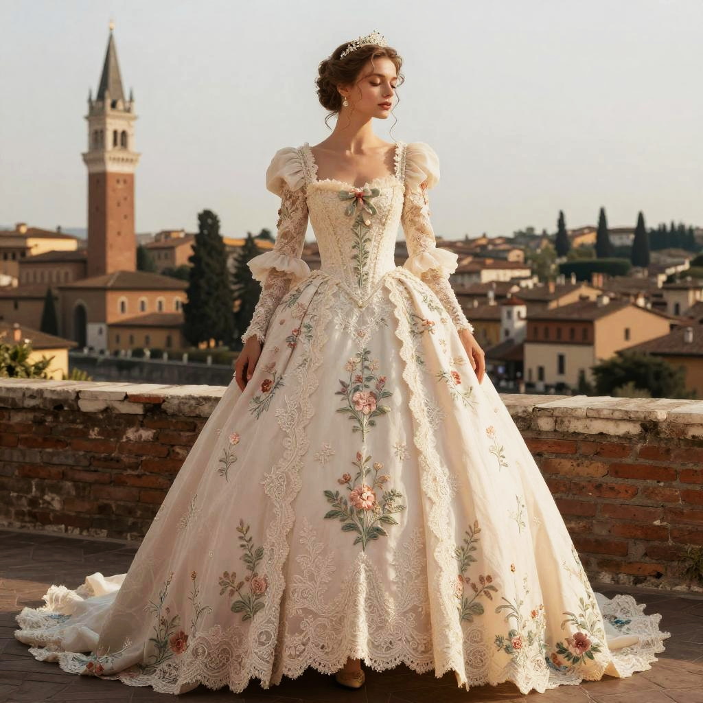 Romeo and Juliet wedding dress, intricate Renaissance gown with delicate lace, soft pastel tones, floral embroidery, ethereal lighting, romantic Verona backdrop, cinematic style
