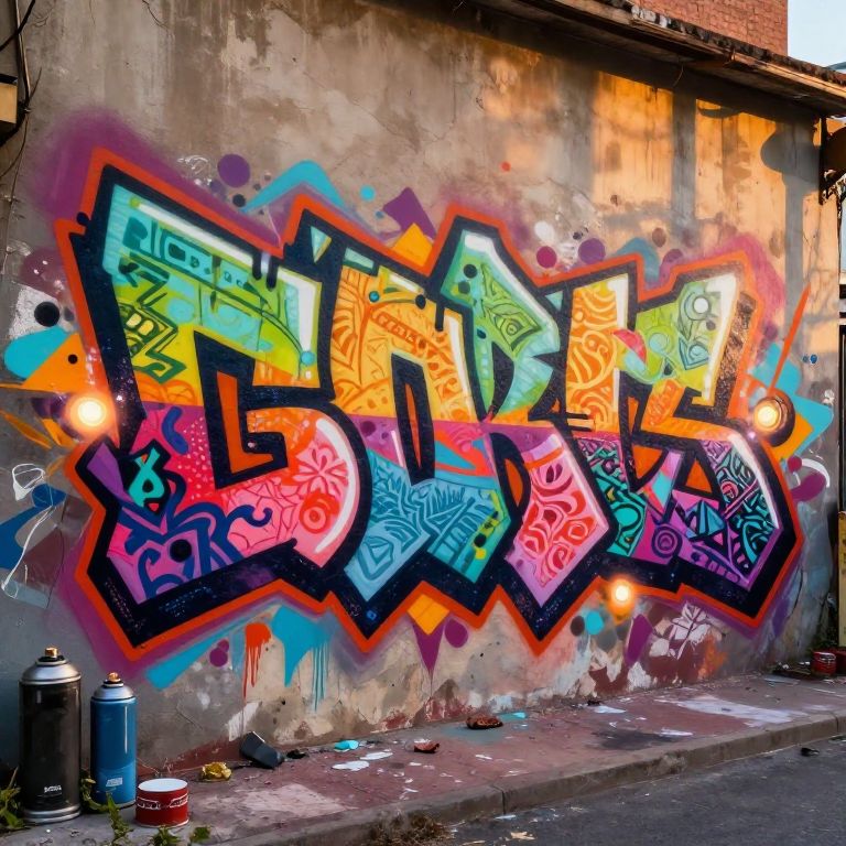 Graffiti font generator, colorful and abstract graffiti letters with intricate patterns and splattered paint effects, illuminated spray cans and digital elements merging, urban alleyway in sunset lighting, detailed and creative.