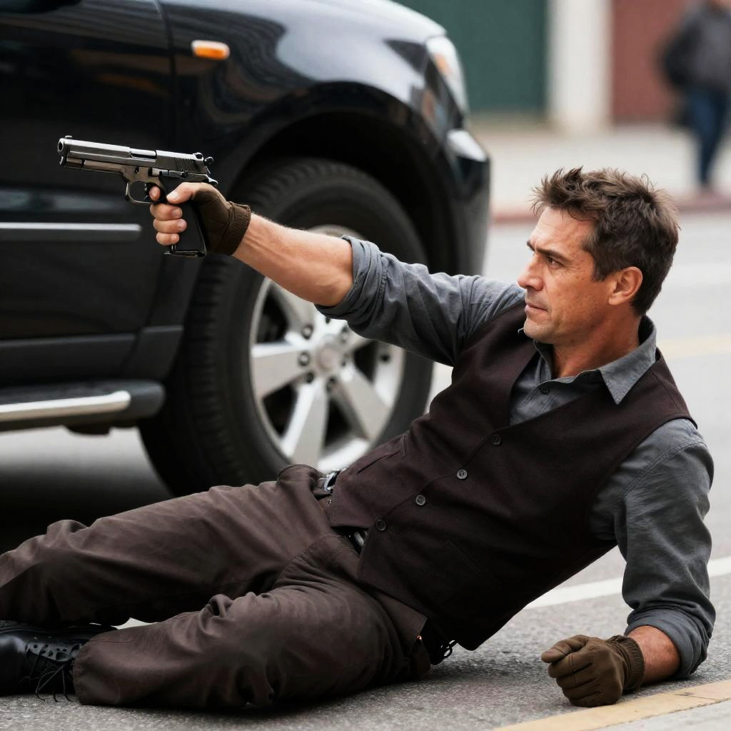 Man with tan skin, wearing light blue shirt, beige jacket, white pants, and straw hat, points silver gun at burning car wreckage. Car's tires and engine parts are charred and scattered around. Flames and smoke rise from car. Man's expression is focused. Car wreckage is in the background, partially obstructing the man.