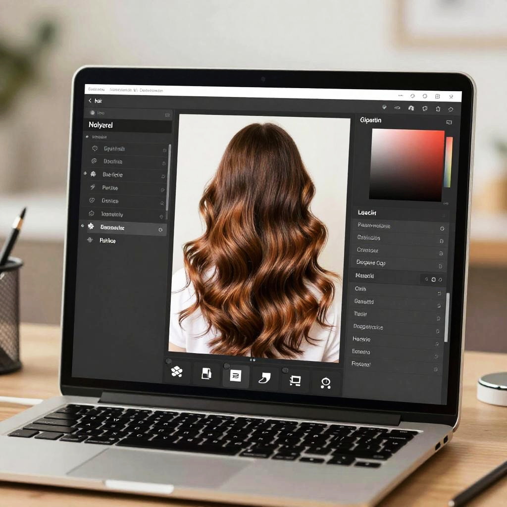 Fix hair in photo online free, showing a vibrant digital interface with intuitive editing tools enhancing hair details, smooth strands, and natural colors, surrounded by a glowing laptop screen in a modern workspace with soft lighting.