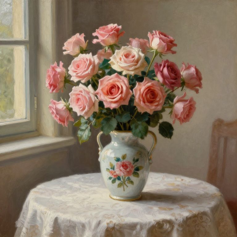 Impressionist-style painting of a glass vase with five red and pink roses, green leaves, and a soft greenish background.