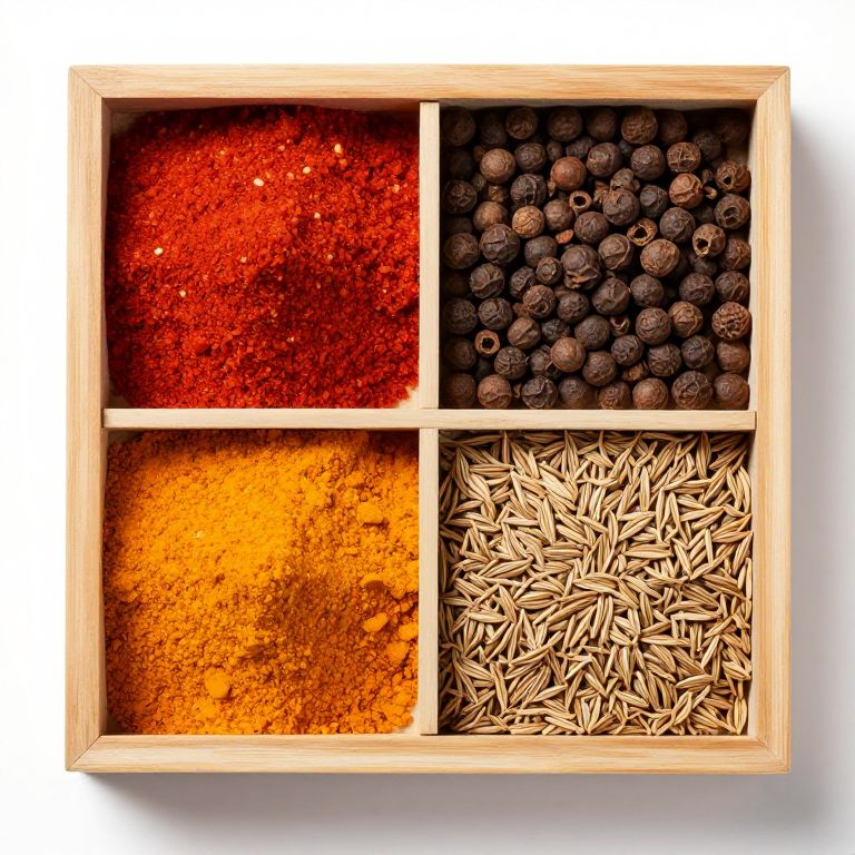 Wooden spice box containing four compartments filled with vibrant dry spices—red chili powder, orange turmeric, brown peppercorns, and light beige cumin seeds—arranged neatly against a clean white background.