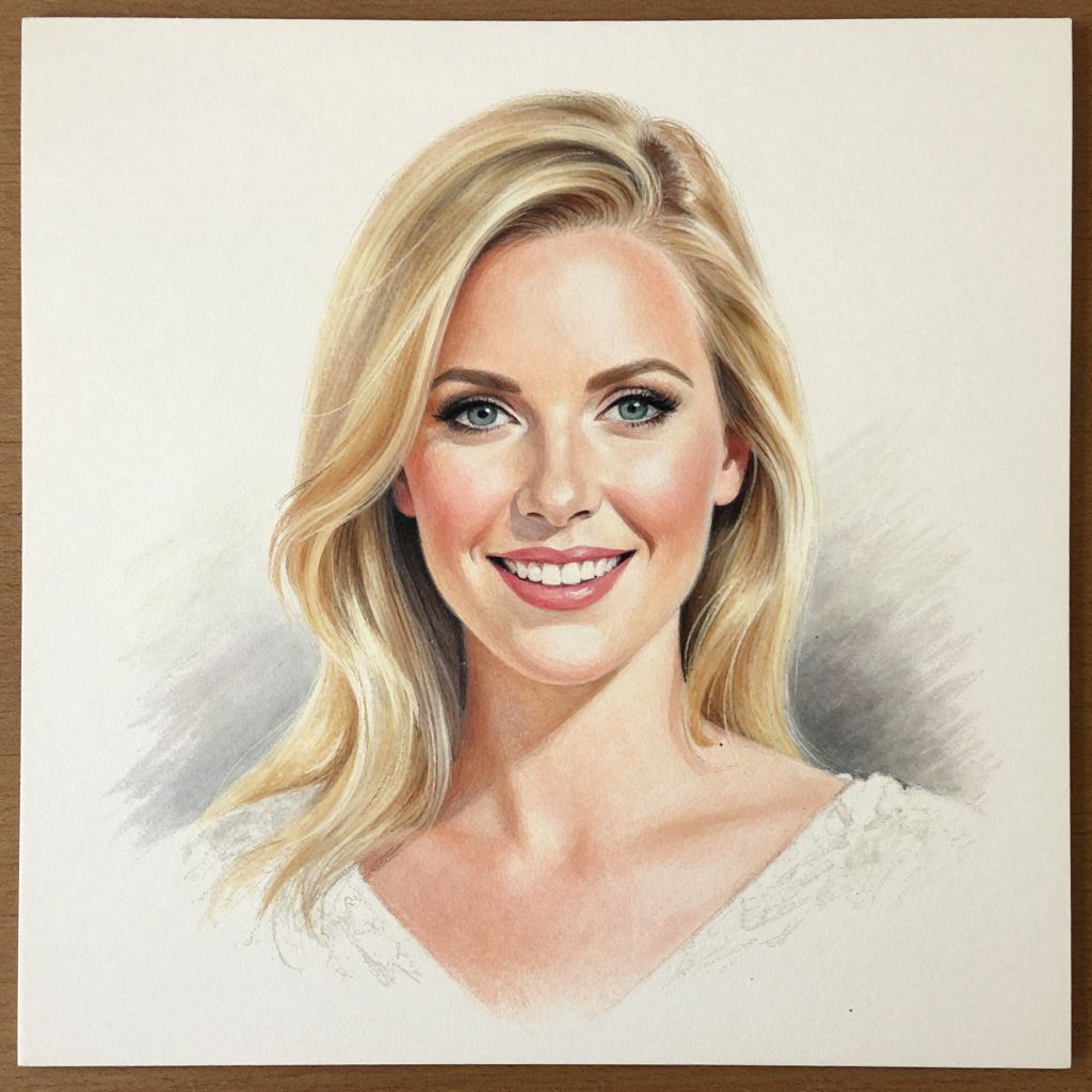 This is a digital drawing in a realistic style depicting a smiling blonde woman with light blue eyes. She has wavy, shoulder-length hair and is wearing a white, slightly textured, V-neck top. Her skin is fair, and she has subtle makeup, including pink lipstick. The background is a simple, gradient mix of white and gray, with a brown border framing the image. The woman's expression is warm and approachable, and the overall composition is centered, focusing on her face and upper shoulders.