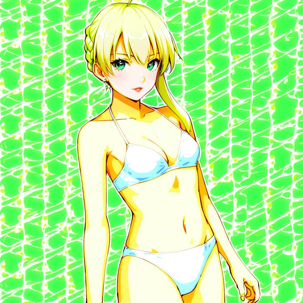 Artoria pendragon (swimsuit archer) (fate), fate (series), 1girl, green eyes, blonde hair, long hair, short hair, ahoge, sidelocks, braid, medium breasts, small breasts, cleavage, navel, white bikini, by artist sayori (neko works), anime