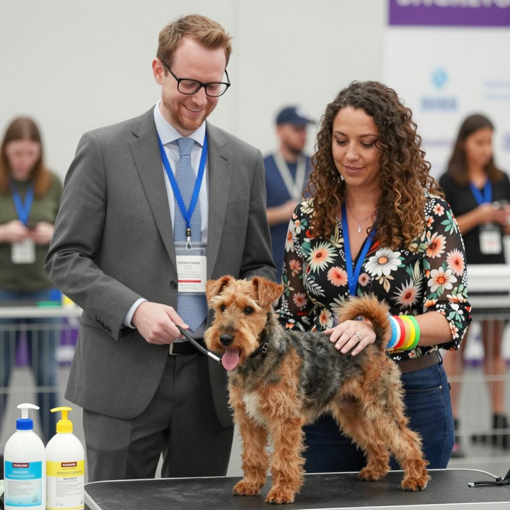 Man with glasses in gray suit and tie, smiling, standing next to curly-haired woman in floral blouse with "20" armband, both looking at tan terrier dog with wiry coat. Background: indoor dog show with blurred people and cages. Table with dog grooming supplies in foreground. Man holding dog's leash with name tag.