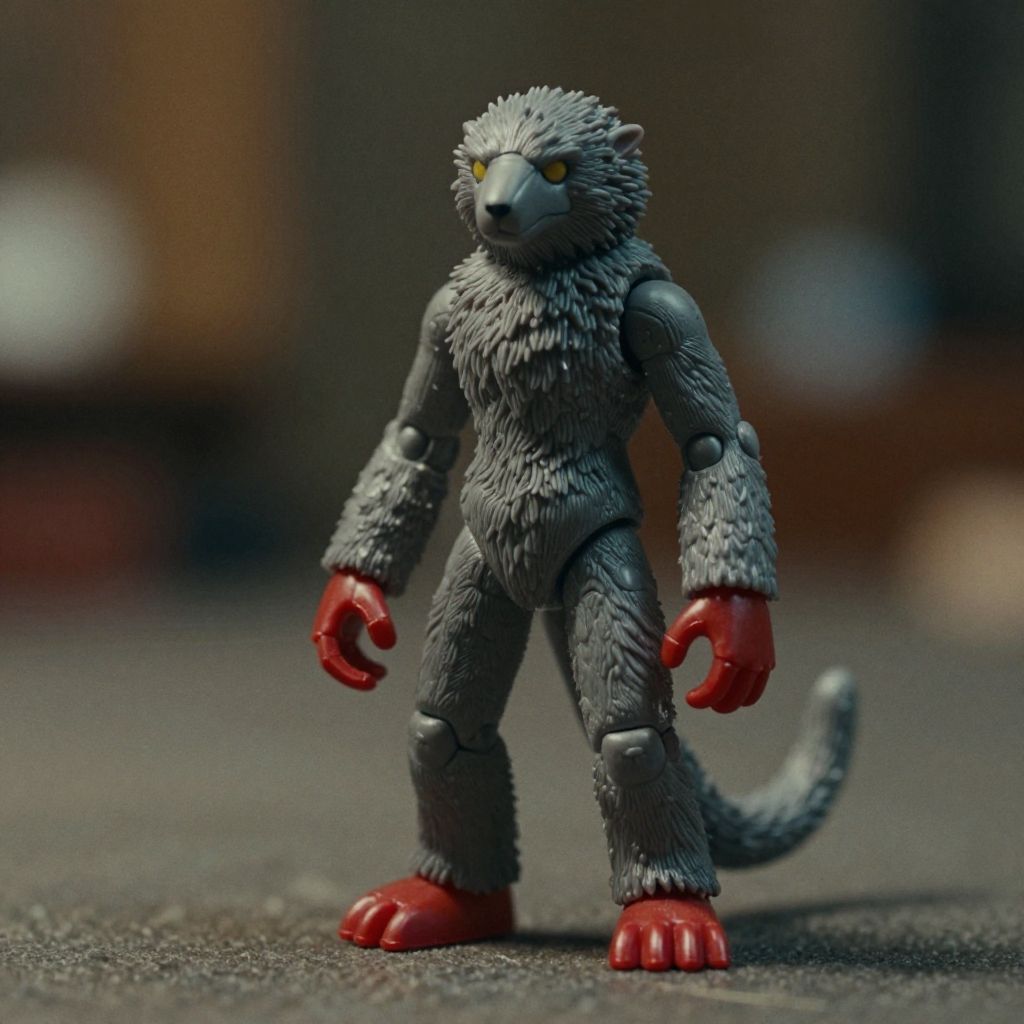 Photograph of a detailed action figure resembling a grey-furred, humanoid monkey with yellow eyes. The figure has a textured, grey fur-covered body, red clawed hands and feet, and a long, curved tail. The background is blurred with indistinct dark and brown hues, suggesting an indoor setting. The figure stands upright on a grey, textured surface. The lighting is soft, highlighting the figure's fur and red accents. The overall style is realistic, with a focus on the figure's detailed anatomy and textures.