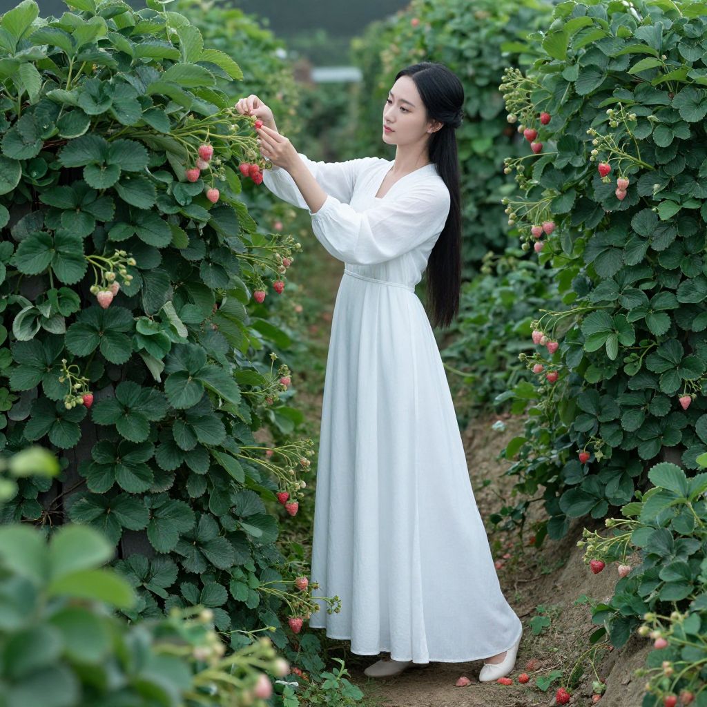 Woman in a flowing white gown stands gracefully amidst a dense garden of vibrant pink strawberry plants, gently plucking ripe berries while surrounded by lush green foliage and scattered fruit on the ground.