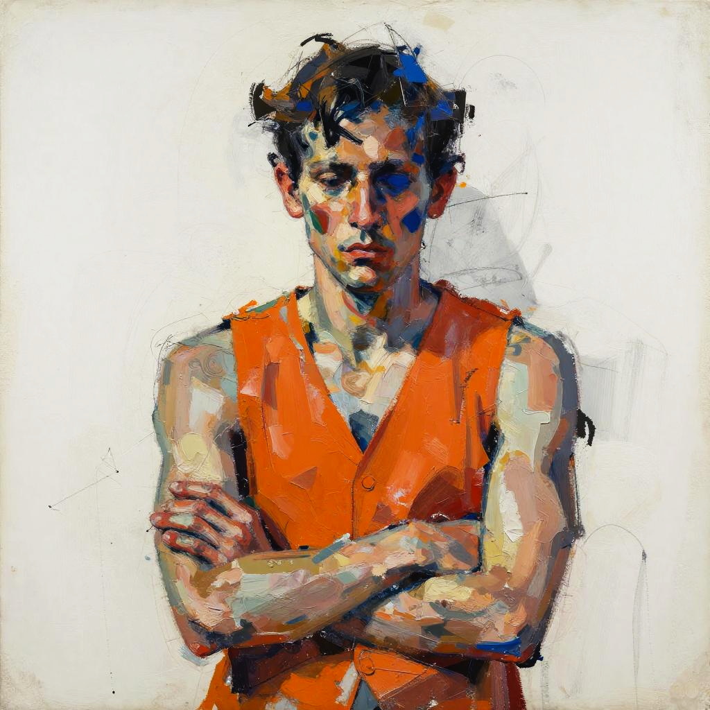 Expressionist semi-abstract portrait of distorted man in burnt orange vest and swirling slate-colored hands, rendered in neo-expressionist collage merging oil paint and rough charcoal lines, high-contrast bold colors, loose gestural strokes and textured paint ridges, minimal white negative space with asymmetrical crop, cobalt-shadow accents and suggestive contours, emotive quiet fury balanced with melancholy introspection, contemporary art poster vibe, painterly chaos with subtle drips, unresolved edges, luminous highlights.