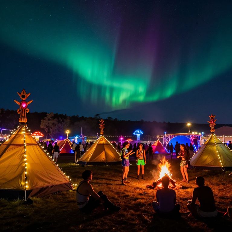 EDC festival campsite under starry sky, tents decorated with fairy lights and totems, festival-goers in expressive neon outfits sharing stories around a bonfire, a cosmic vibe with glowing mushrooms and aurora borealis enhancing a magical electronic dance experience