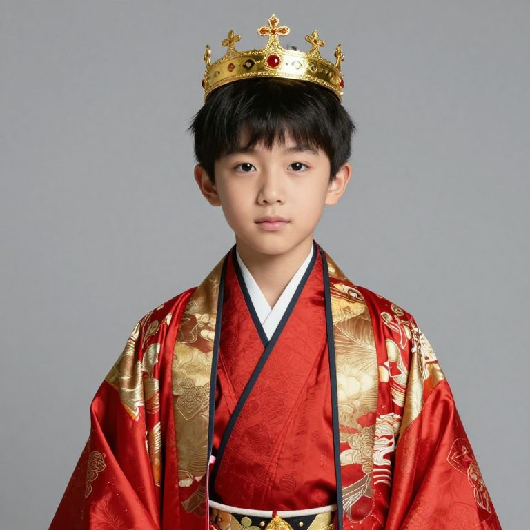Asian boy wearing a red and gold kimono with a crown on his head.