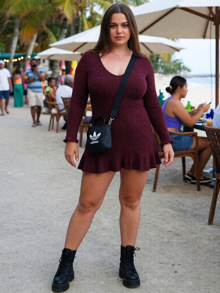 A Plus-size woman in casual streetwear, wearing a textured maroon knit mini dress with white flecks, V-neckline, long sleeves, and a flared skirt, complemented by a contrasting black diagonal shoulder strap. She carries a small black Adidas shoulder bag with a white logo and sports chunky black lace-up boots with thick soles. Set against the vibrant backdrop of a tropical island beachfront dining, captured in the visual style of Eastman LLP film stock. Sexy. Pretty face and beаutiful eyes. Big breasts