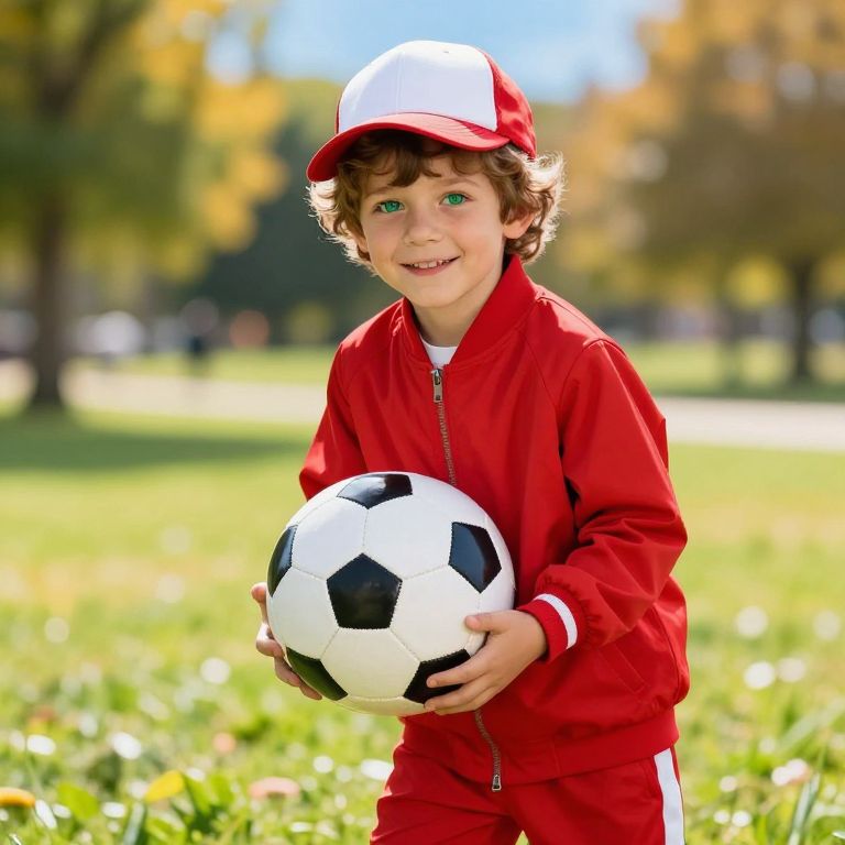 A young boy with bright, curious eyes and a mischievous smile is wearing a classic baseball uniform with a red and white checked jersey, gray pants, and a navy-blue hooded jacket. He has a baseball cap tilted slightly on his head, the brim shadowing his face as he stands confidently on a sunny field, surrounded by green grass and a softly glowing sunset in the background. The atmosphere is lively and joyful, capturing the energy of a summer game.