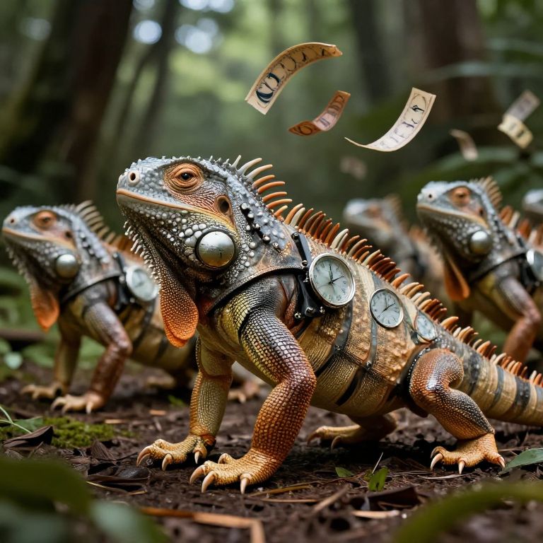 Photograph of three iguanas in a forest, adorned with clock faces and dollar bills floating above them, blending realistic and surreal elements.