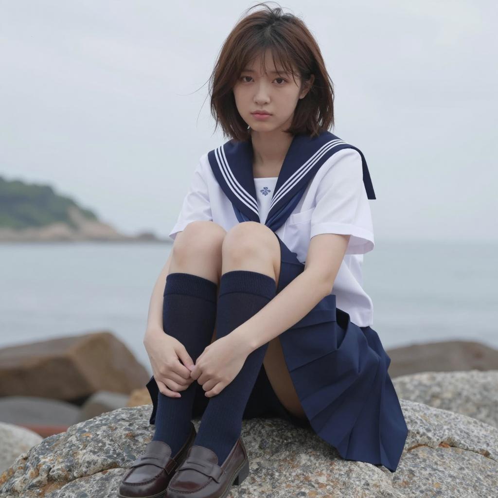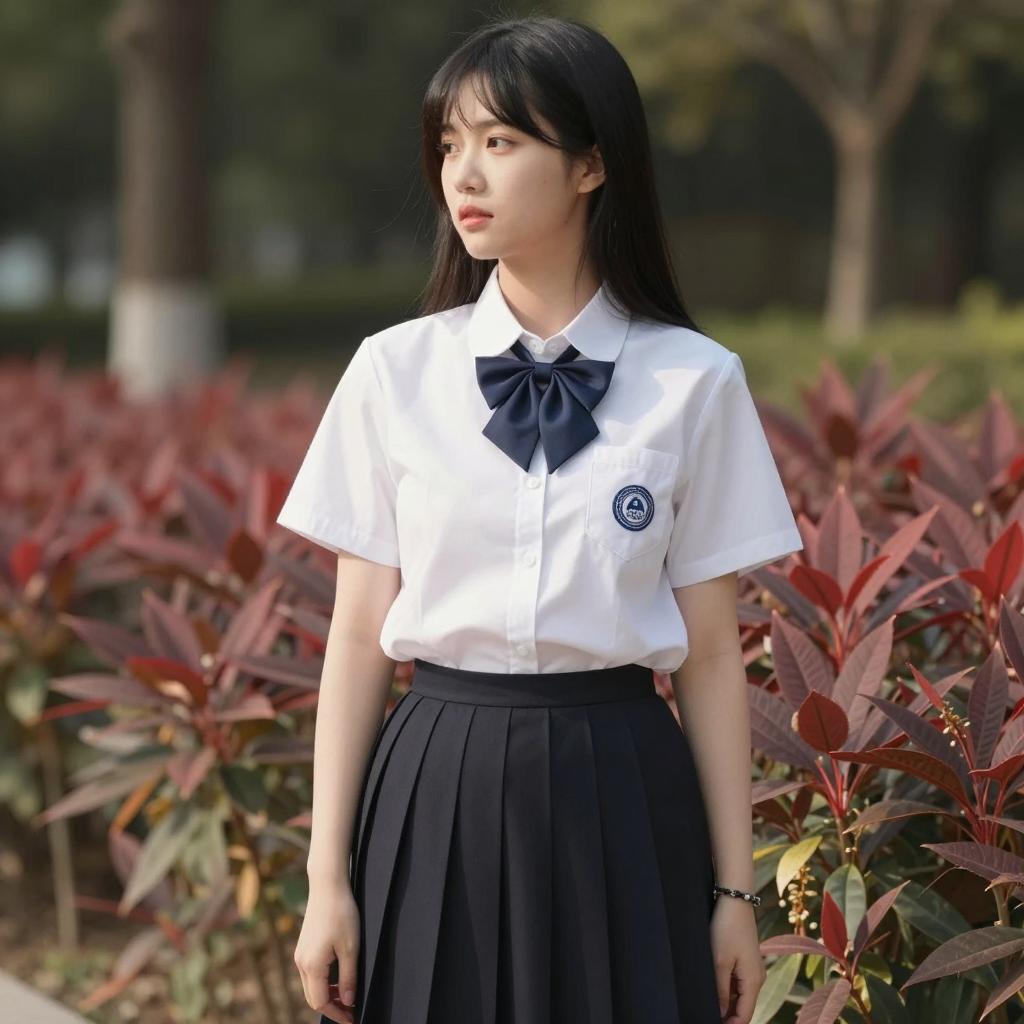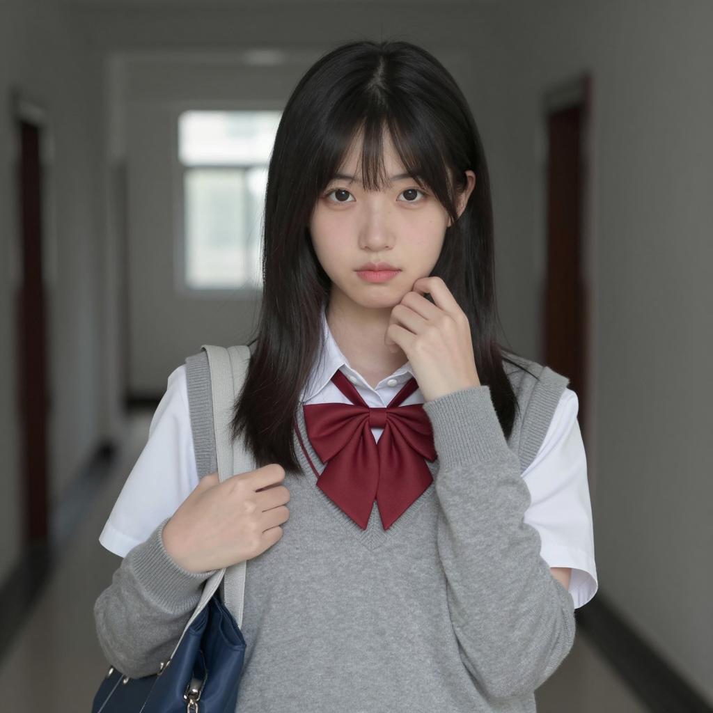 Young Asian woman with shoulder-length black hair, wearing a white sailor school uniform with blue stripes and a red bow, sitting on the ground with her chin resting on her hand. She has a neutral expression. Brown leather backpack with a decorative bow on her left side. Green hedge in the background. Bright outdoor setting. Her legs are folded underneath her. Her right arm rests on her knee. Her eyes are slightly downcast. Blurred background.