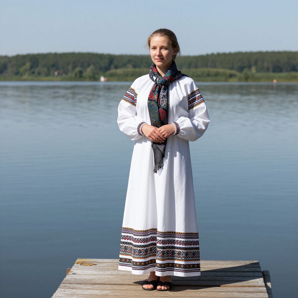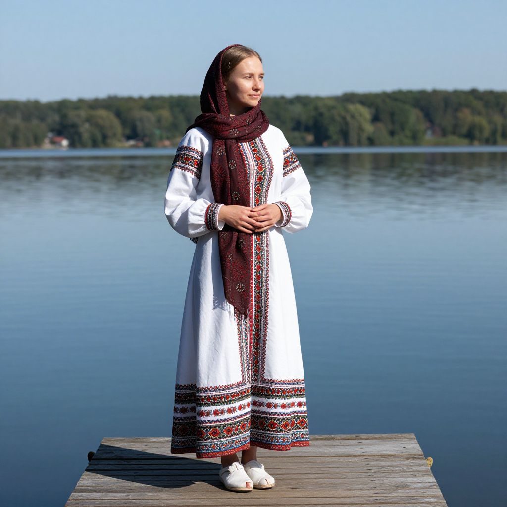 Photograph of a young woman standing on a wooden dock by a calm lake. She has light brown hair pulled back and is wearing a long, white traditional Ukrainian dress with black and red embroidered patterns on the sleeves, chest, and hem. A black and red embroidered scarf is draped around her neck. She is barefoot, standing with her hands gently clasped in front of her. The background shows a clear blue sky, a green forested shoreline, and a serene lake, creating a peaceful, natural setting. The dock is slightly weathered, adding a rustic touch to the image.