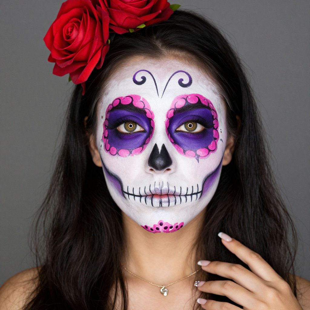 Woman showcasing vibrant candy skull Halloween makeup featuring bold pink and purple accents, intricate eye designs, and a striking red rose accessory in her hair, complemented by a delicate necklace and manicured nails.
