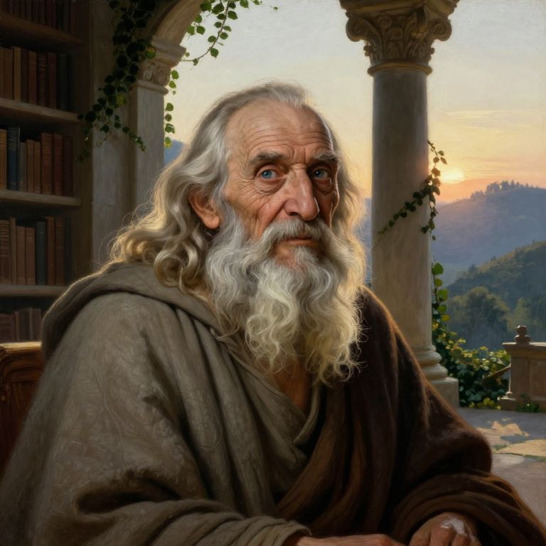 A captivating portrait reminiscent of a classical oil painting depicts an enigmatic sage with wrinkled skin and shy blue eyes, radiating deep knowledge. His thick white beard frames a gentle smile as he sits amidst an ancient library's towering stone columns covered in ivy. The serene hilltop dawn setting is illuminated by the first rays of sunlight from behind, casting dramatic shadows that highlight his aged visage's wisdom. Viewed from a low-angle 'bug's-eye view', this evocative portrait invites contemplation on life experiences and the passage of time through the enigmatic character.
