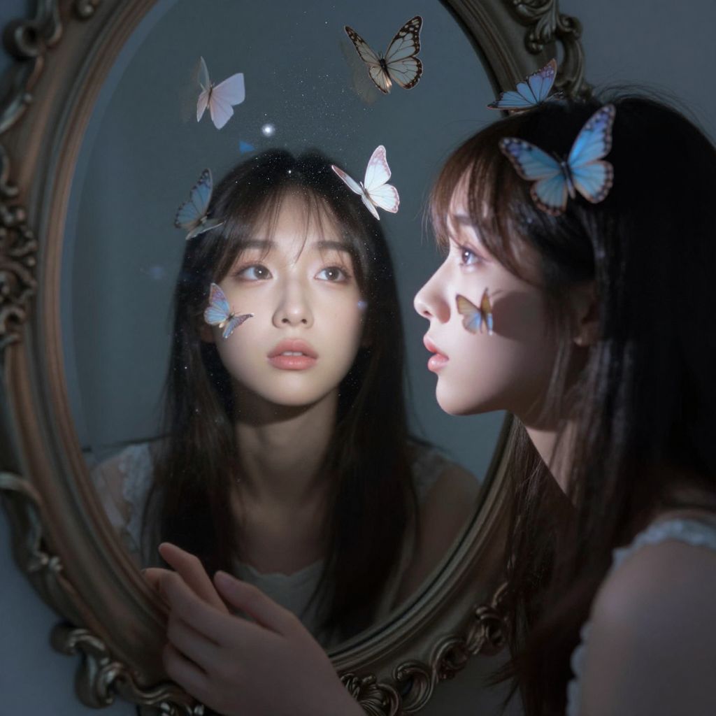 Photograph of an East Asian woman with long black hair, fair skin, and delicate features, gazing into an ornate oval mirror. She wears a white sleeveless top and has blue butterflies with glowing accents on her head and in the mirror's reflection. The mirror, with a vintage gold frame, captures her introspective expression. The background is dark blue, creating a mystical, ethereal atmosphere with soft, moody lighting highlighting her face and the butterflies. Her hand gently holds the mirror's edge, adding a sense of gentle curiosity and introspection.