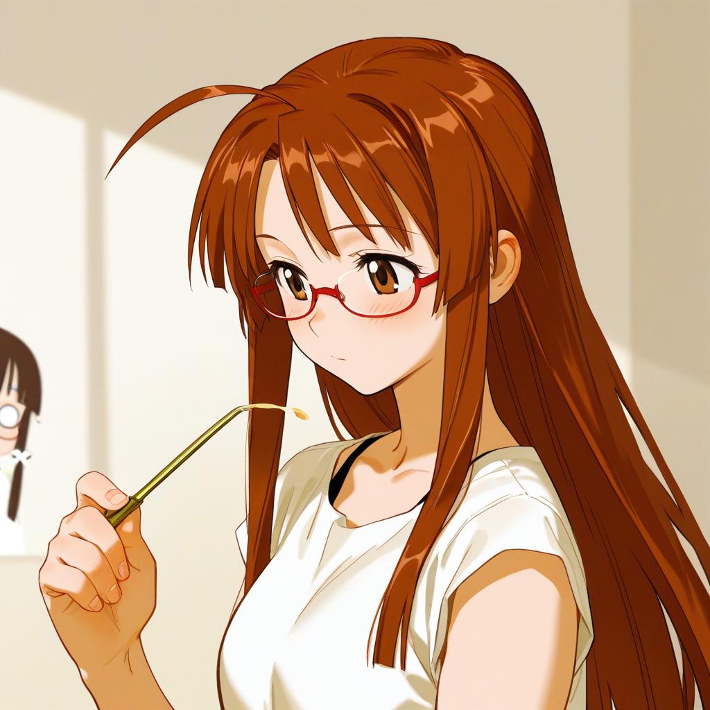 Illustration of a young anime girl with long brown hair and brown eyes, wearing red glasses and a white sleeveless top. She has an ahoge strand and is holding a thin object near her face, with a soft light background. Another anime character with glasses is faintly visible in the background.