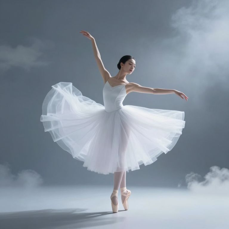 A graceful ballerina in a flowing white tutu dances amidst ethereal clouds, her fluid movements evoking the impressionistic interplay of light and mist, as if choreographing the very weather patterns around her in a dreamlike, high-definition digital rendering.