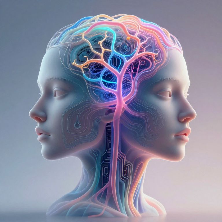 Digital CGI image of a blue-toned human head in profile, showing glowing, multicolored neural networks and circuitry patterns.