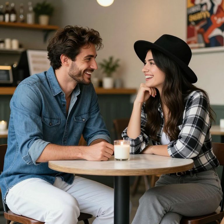 Photograph of a cute couple sitting at a small café table. The guy on the left has dark hair, a trimmed beard, and wears a blue denim shirt with white pants. He's smiling at the girl on the right, who has long dark hair, wears a black hat, and a black-and-white plaid shirt with gray pants. Both are laughing. A lit candle is on the table. The background is blurred, showing shelves and a wall with posters.