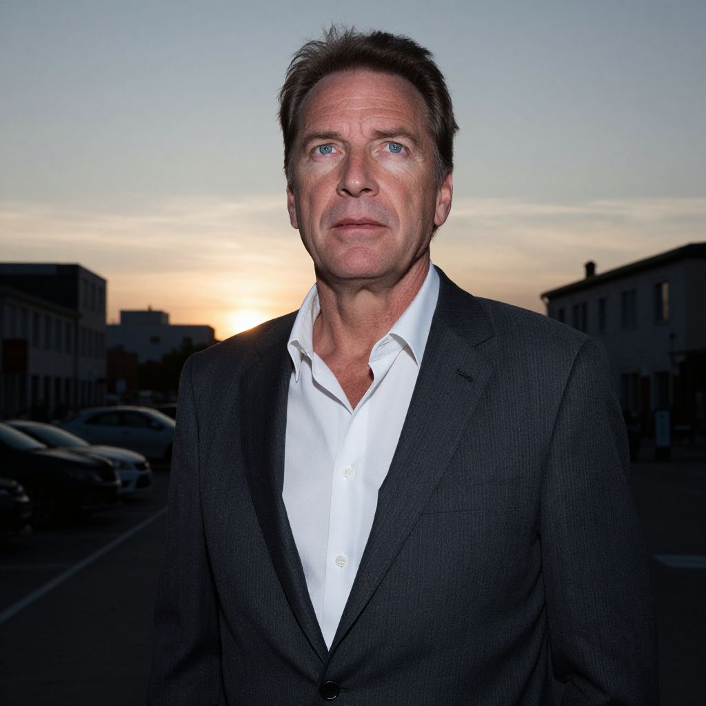 A middle-aged Caucasian man stands confidently against an urban backdrop at dusk, his piercing blue eyes reflecting the setting sun's final rays as soft evening light accentuates the deep lines of experience etched across his face. He wears a tailored suit with subtle pinstripes and a crisp white shirt open at the collar, hinting at both his professional success and personal warmth. His expression is one of thoughtful reflection, suggesting stories waiting to be shared or questions yet unanswered in this candid moment captured from an unexpected low angle that elevates him above the urban chaos around him.