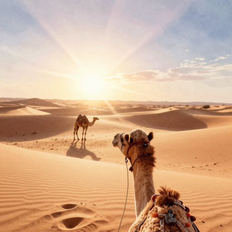 A tranquil desert dawn is rendered in an ethereal watercolor style, with soft borders and radiant hues casting a glow upon the sandy dunes. The sun emerges as though seen through a prism, its rays weaving an intricate tapestry of light that bathes a lone camel wandering across the boundless expanse. From an 'ant's perspective', we experience the world from the viewpoint of an inquisitive insect perched atop the camel's hump, witnessing the awe-inspiring panorama unfold in a harmonious fusion of untamed nature and dreamlike imagery, invoking sensations of amazement and serenity amidst the untouched wilderness.