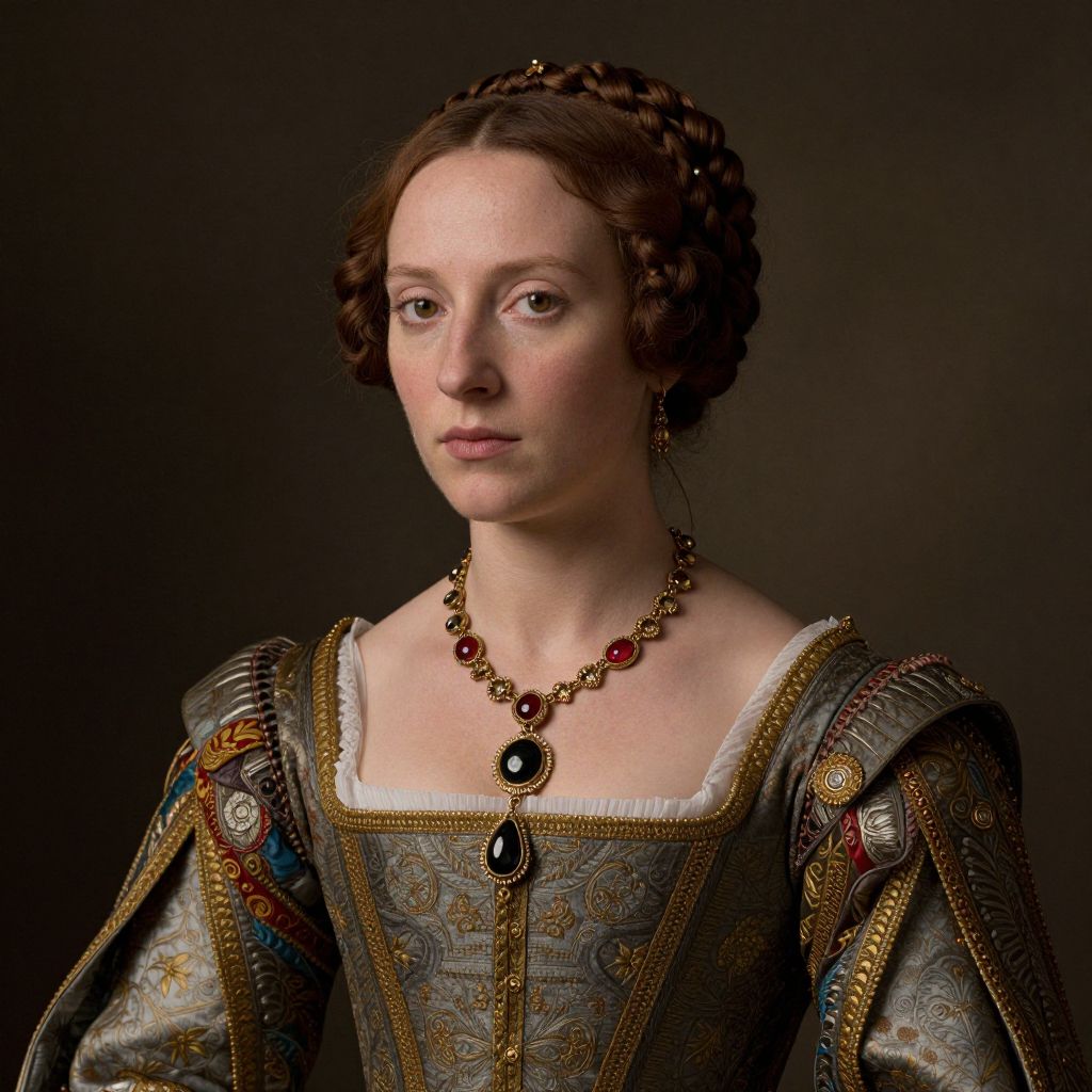A digitally rendered portrait in a Renaissance-inspired style depicts a woman adorned in ornate period clothing, featuring intricate jewelry and a braided hairstyle, evoking a sense of historical elegance and contemplation.