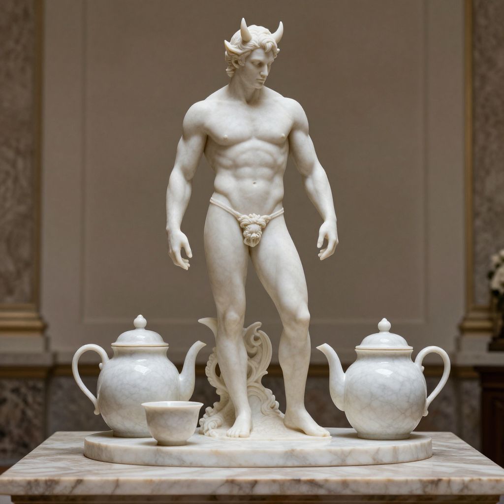 Tea Set cinematic marble sculpture of the devil as an attractive muscular man standing on a marble platform cinematic photo real,