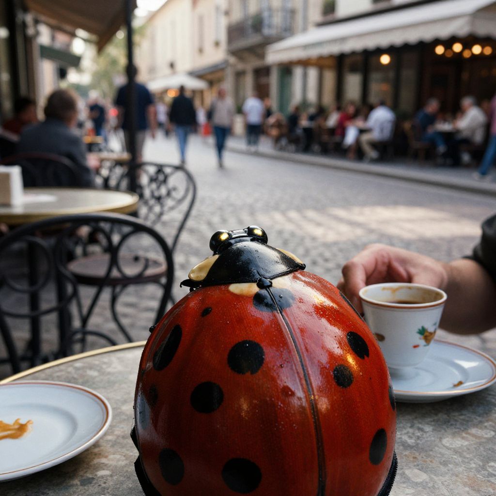 Photograph of a vibrant, detailed red ladybug figurine with black spots, positioned on a stone-tiled outdoor café table. In the foreground, there's a white ceramic cup with a saucer, and a partially visible plate with a small piece of food. In the background, a cobblestone street is bustling with people, blurred due to depth of field. The café has wrought iron chairs and tables, with an awning overhead. Sunlight casts soft shadows, and the scene suggests a lively, European street setting. The ladybug's glossy texture contrasts with the matte stone table.