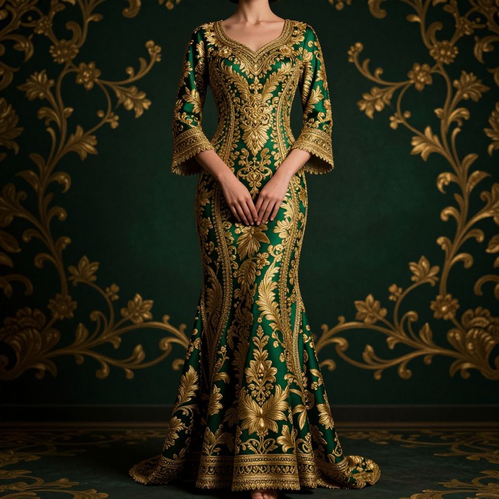 Photograph of a woman standing in a dark, ornate room. She is wearing a long, green and gold floral-patterned evening gown with intricate gold embroidery and three-quarter sleeves. The dress has a deep V-neck and a flowing, floor-length skirt. Her hands are gently clasped in front of her. The background features a dark, textured wall with gold floral and vine patterns, enhancing the luxurious, regal appearance. The lighting highlights the gold embroidery, creating a rich, opulent effect. The woman's face is not visible, focusing attention on the elaborate dress and detailed background.