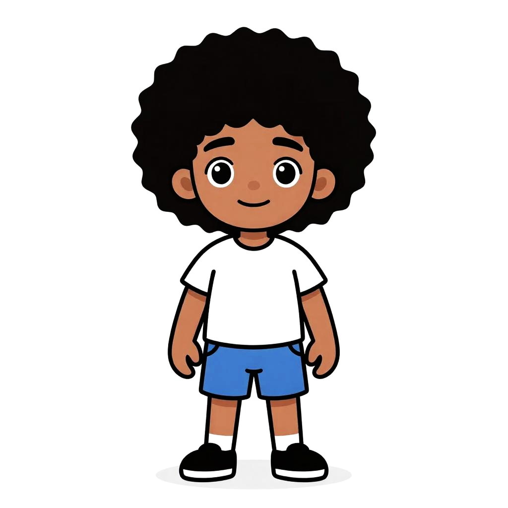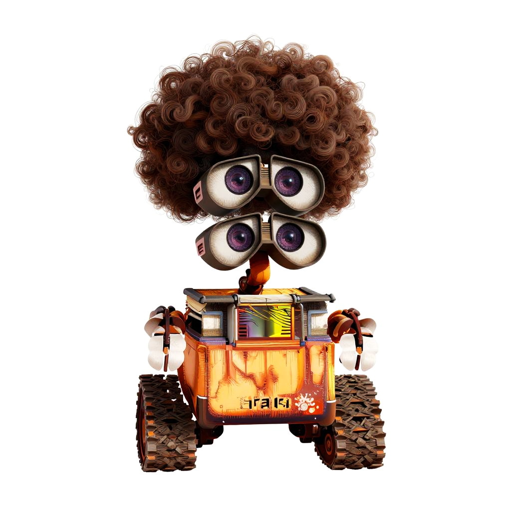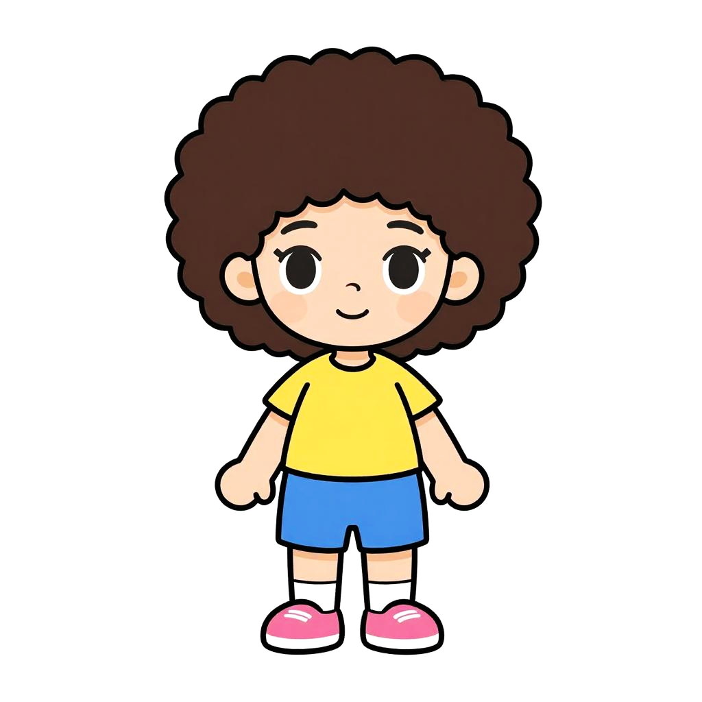 Cartoon bird with yellow body, blue wings, and a large brown afro, standing on orange legs, against a white background.