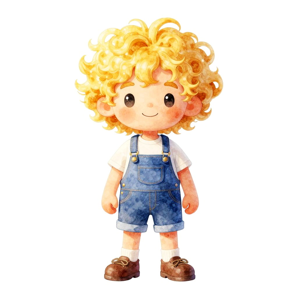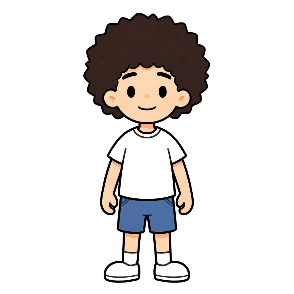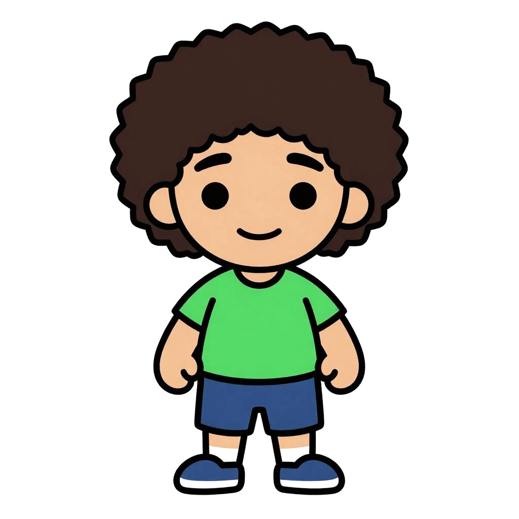 Cartoon bird with yellow body, blue wings, and a large brown afro, standing on orange legs, against a white background.