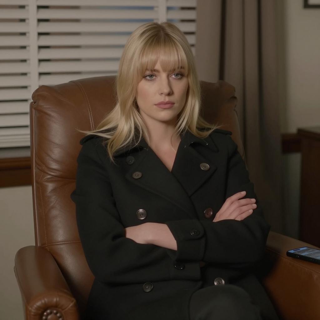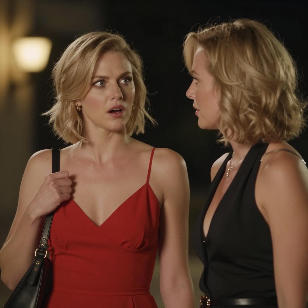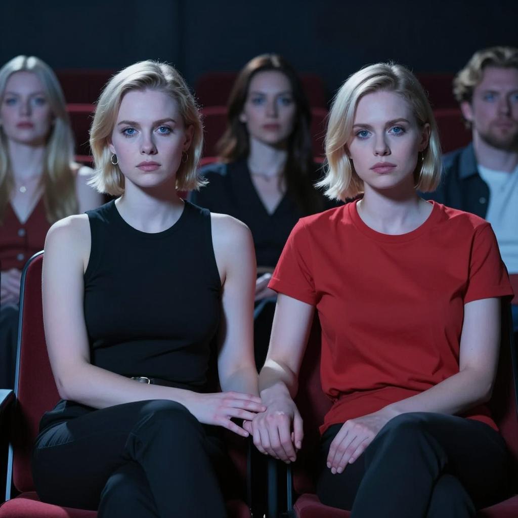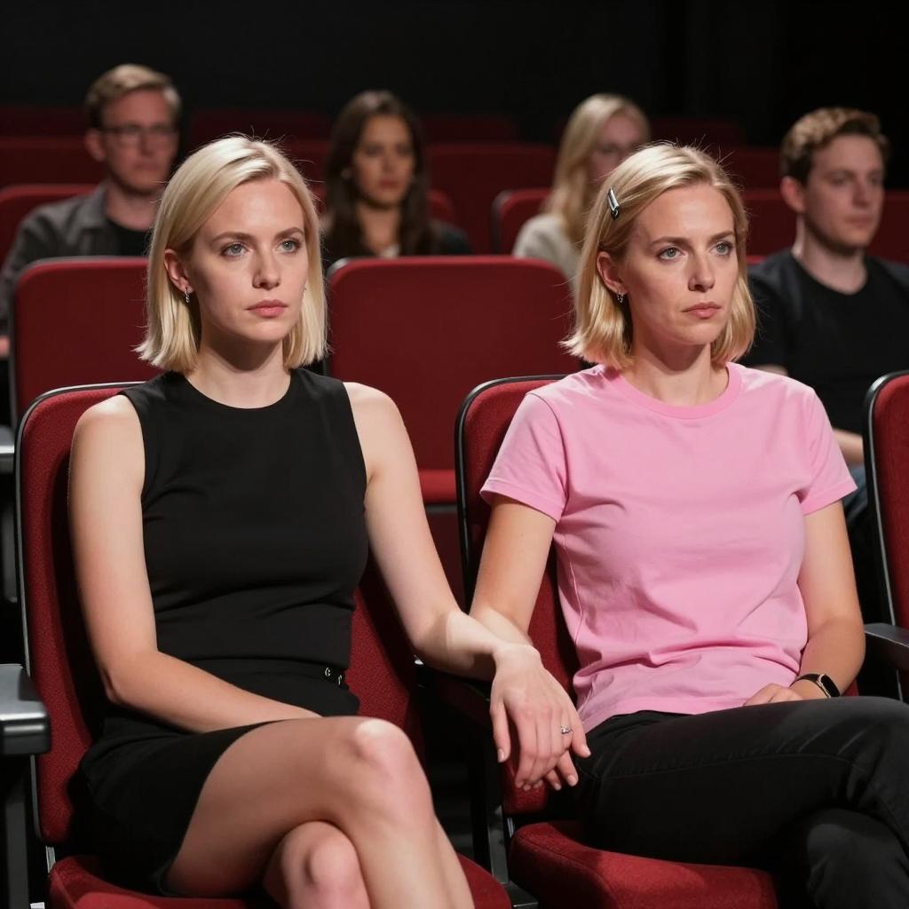 Photograph of two women sitting in red theater seats. Woman on left with short blonde hair, black sleeveless dress, holding hands with woman on right. Woman on right with short blonde hair, pink t-shirt, hair clip, looking forward. Dimly lit theater background with blurred audience. Both women with serious expressions.