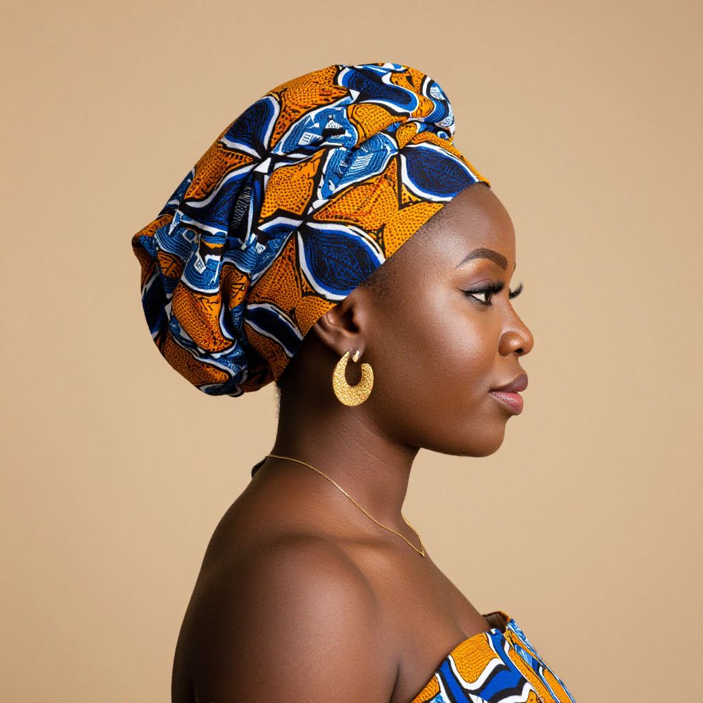 Photograph of a dark-skinned African woman in profile, wearing an orange and blue patterned headwrap, gold hoop earrings, and an orange strap
