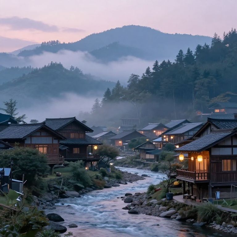 Photograph of traditional Japanese wooden houses with warm lights, nestled along a rocky river, surrounded by misty forested mountains at twilight.