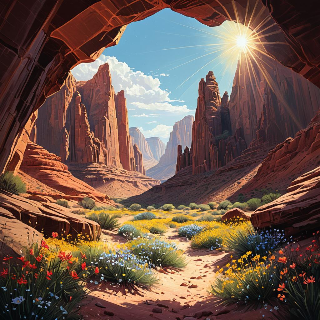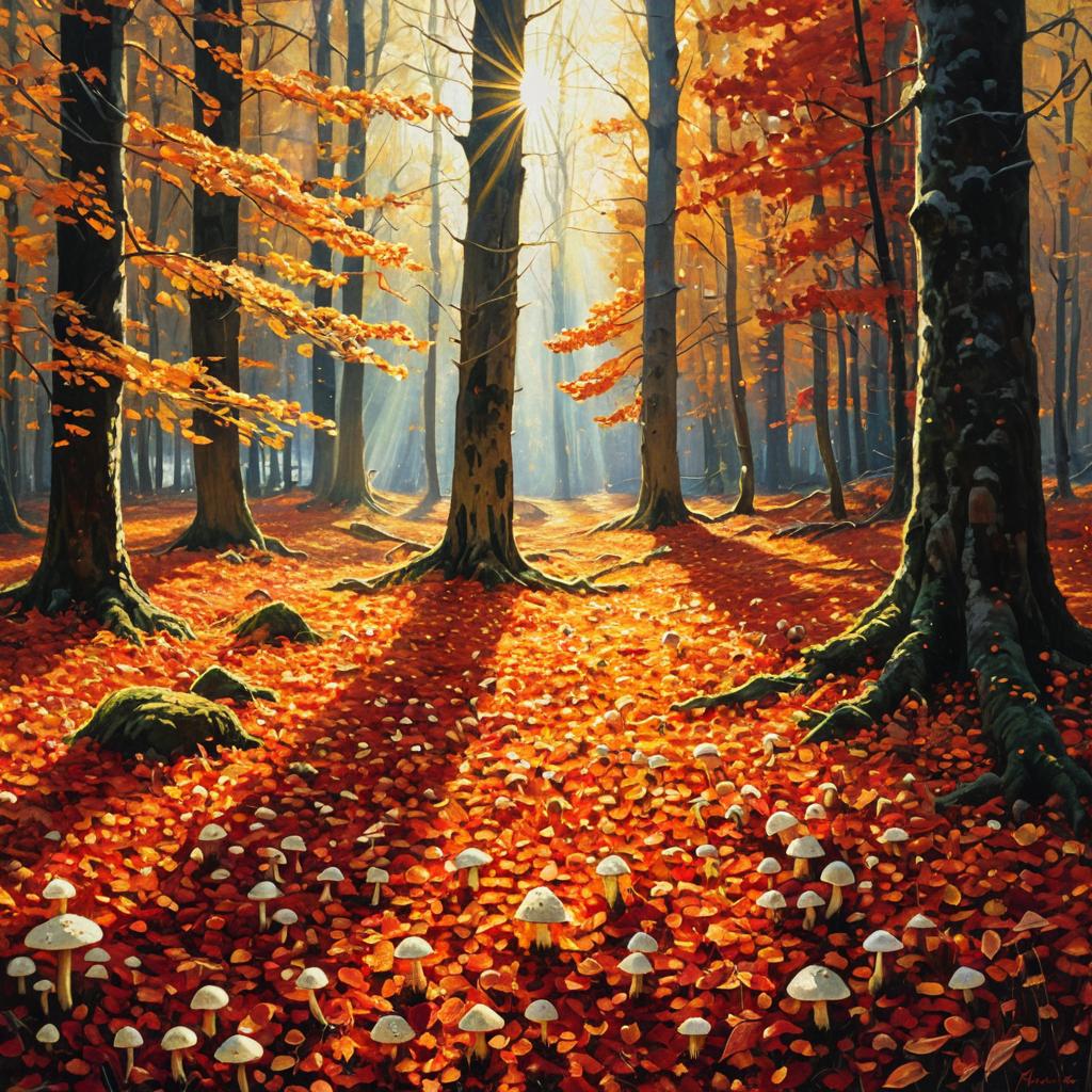 A sunlit autumn forest glade with vibrant red and orange leaves, featuring a golden leaf carpet dotted with clusters of bright mushrooms, rendered in oil painting with broad textured brush strokes style, with ethereal sunlight filtering through the canopy and no humans.