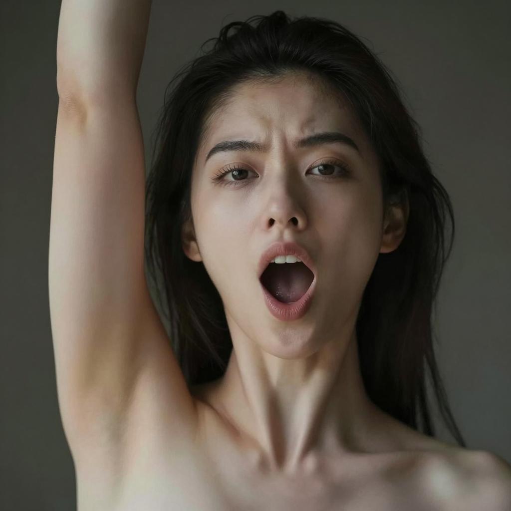 A young woman with light skin, dark hair, and an open mouth, raising her right arm to her head. Her bare shoulder is visible. The background is dark and out of focus. Her facial expression is intense.