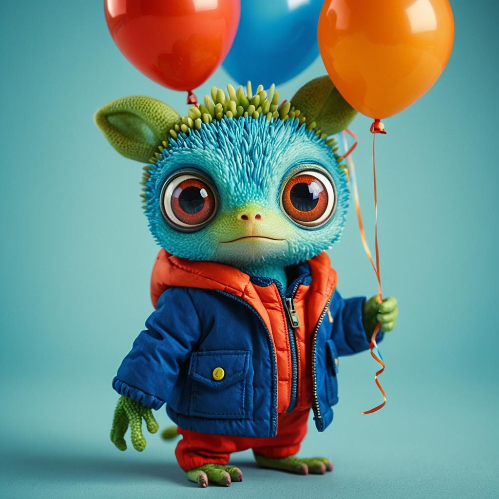 A photorealistic image of a small green creature with large expressive eyes wearing a detailed blue and red jacket, holding a bunch of colorful balloons in red, orange, and blue. The scene is softly lit with a slightly blurred background, emphasizing the cute and vibrant charm of the character.