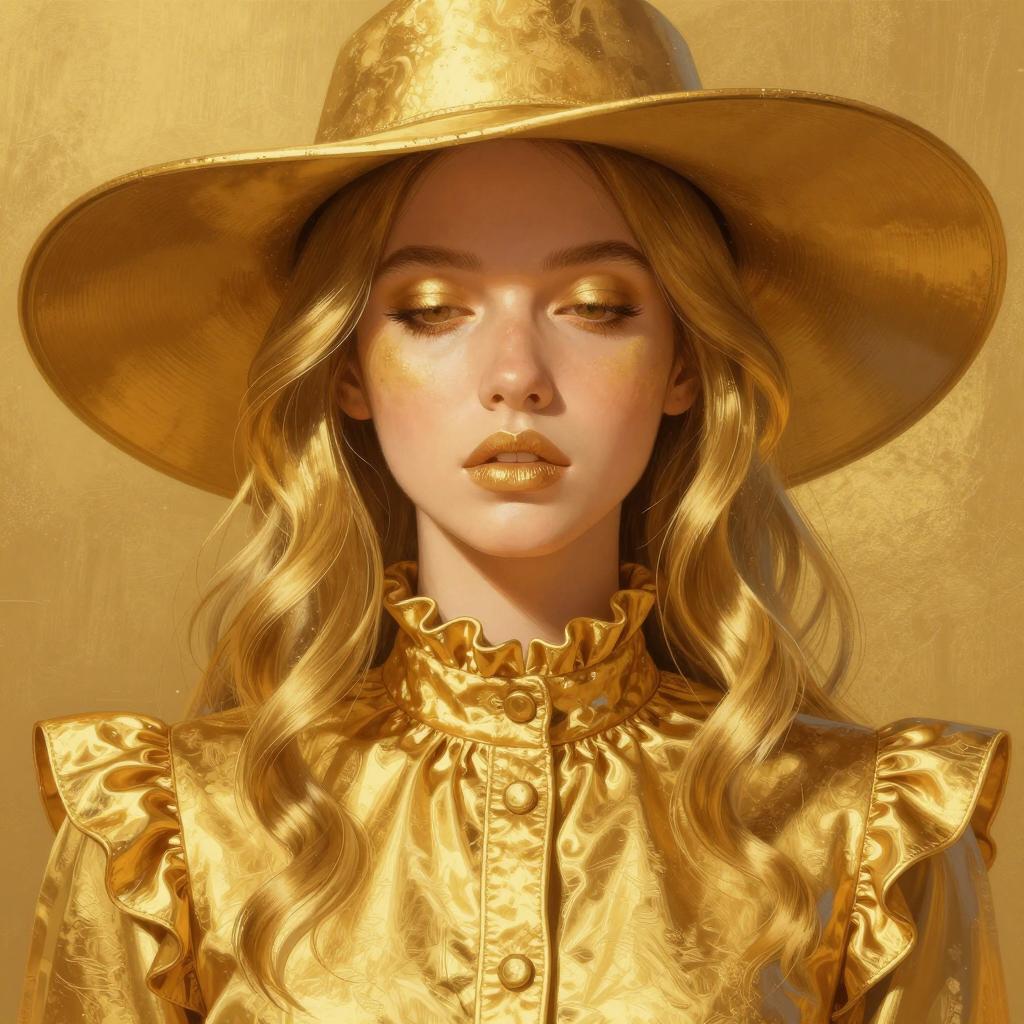 Digital illustration of a woman with smooth, shiny, golden skin and wavy hair. She wears a wide-brimmed hat and a high-collared, ruffled shirt. Her eyes are slightly downcast, and her lips are closed. The background has a ured, golden surface. Her facial expression is neutral. The illustration uses a metallic, high-gloss visual style.