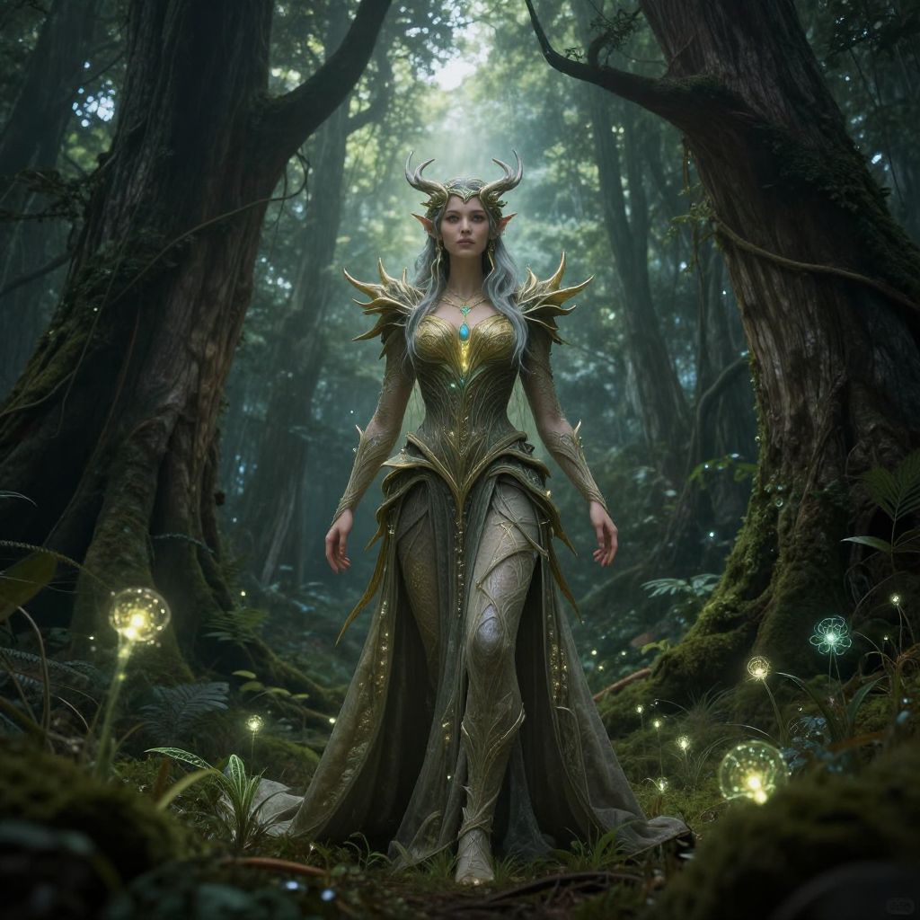 Digital fantasy artwork of a regal, horned, armored woman with glowing gold accents, standing in a mystical forest illuminated by glowing fireflies.