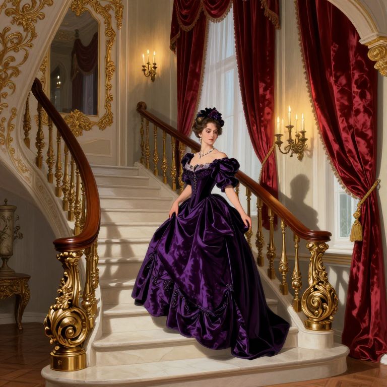 Photorealistic digital painting of a Victorian-era woman standing on a grand, ornate staircase. She wears an elaborate, dark purple, off-the-shoulder ball gown with puffed sleeves, a white lace collar, and a black lace headpiece. Her pale skin contrasts with her dark dress. The staircase features golden, intricately carved banisters and a white marble steps. Rich, red velvet curtains frame a large window in the background, with golden wall sconces casting a warm glow. The elegant setting includes white, ornate walls and a polished wooden floor, evoking a luxurious, historical atmosphere.