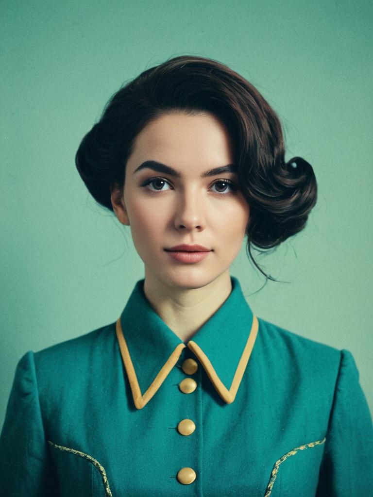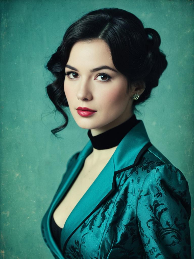 Portrait of a woman in cosplay dressed as Secre Swallowtail (Nero) character. She wears a teal patterned jacket with black trim and a deep neckline. Her hair is styled in elegant dark curls, and she has a black choker and vintage-style earrings. The background is textured teal-green, enhancing the character's dramatic and sophisticated look.