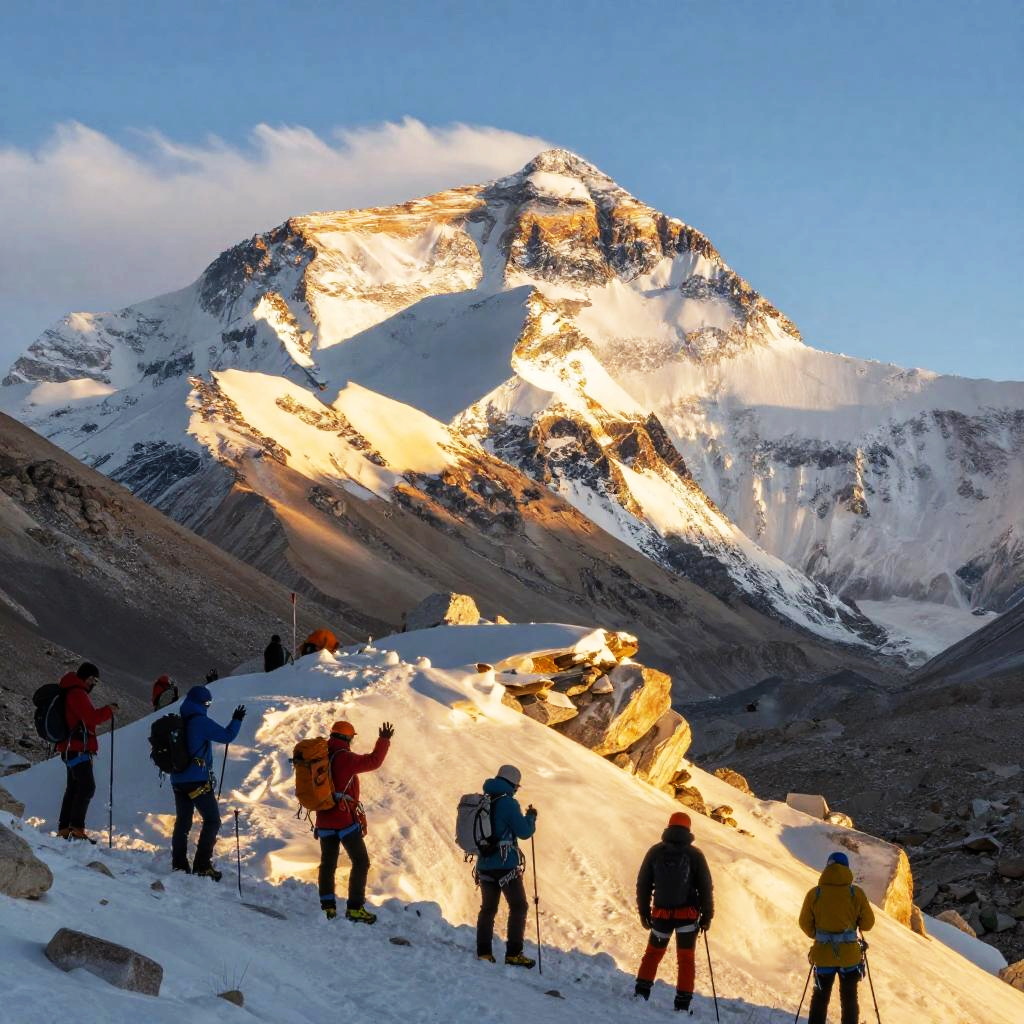 Cima del Monte Everest with sunrise light casting golden hues over the snow, climbers in colorful gear celebrating, whispering winds, rugged terrain, crisp and clear atmosphere, panoramic Himalayas landscape, adventure and achievement vibe