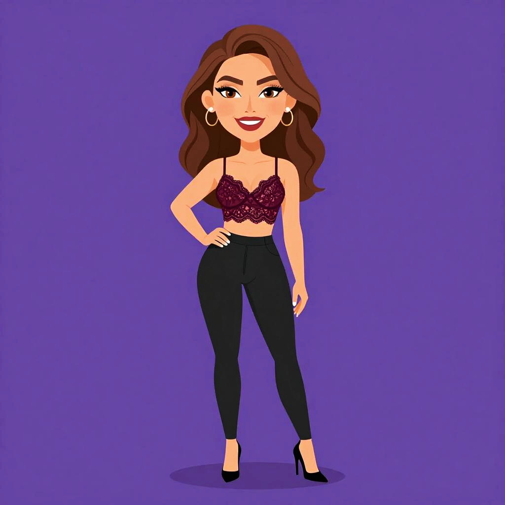 Woman with pretty face and pretty hair. smiling Woman, sexy, burgundy lace crop top with scalloped edges, spaghetti straps, high-waisted black skinny trousers, pointed black stiletto heels. --sref 1467